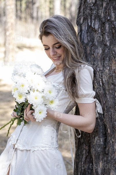Красивая молодая девушка позирует в весеннем сосновом лесу