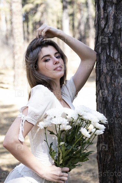 Красивая молодая девушка позирует в весеннем сосновом лесу