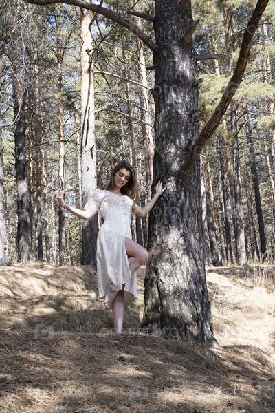 Красивая молодая девушка позирует в весеннем сосновом лесу