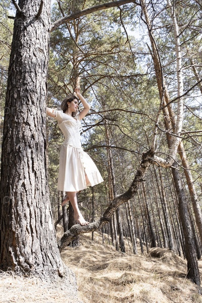 Красивая молодая девушка позирует в весеннем сосновом лесу
