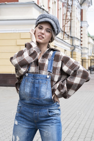 Красивая молодая девушка в кепке и джинсовом комбинезоне на улице города