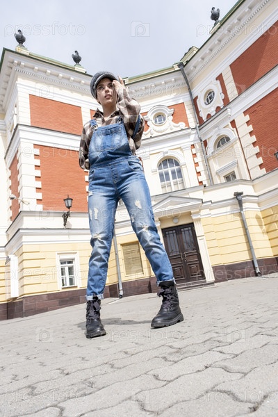 Красивая молодая девушка в кепке и джинсовом комбинезоне на улице города