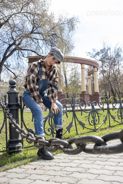 Красивая молодая девушка в кепке и джинсовом комбинезоне на улице города