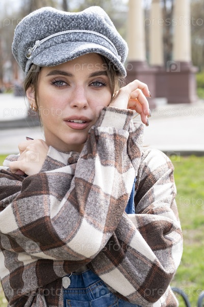 Красивая молодая девушка в кепке и джинсовом комбинезоне на улице города