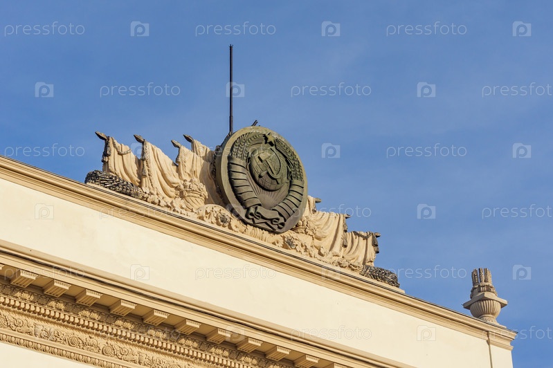 Москва, Россия - 09 апреля 2017 г.: Фрагмент павильона на ВДНХ с советским символом. Образец архитектурного стиля советского периода