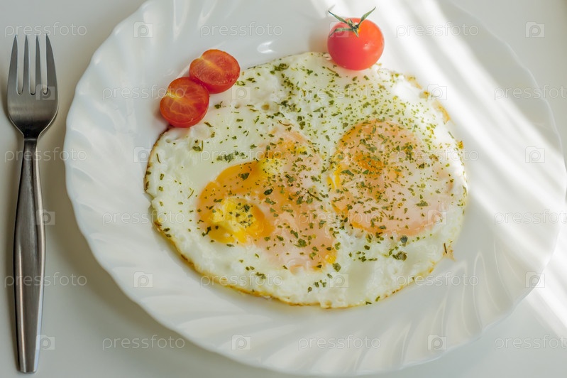Яичница на тарелке с помидорами и рубленой петрушкой
