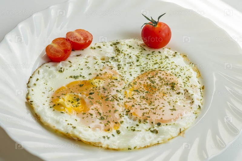Яичница на тарелке с помидорами и рубленой петрушкой