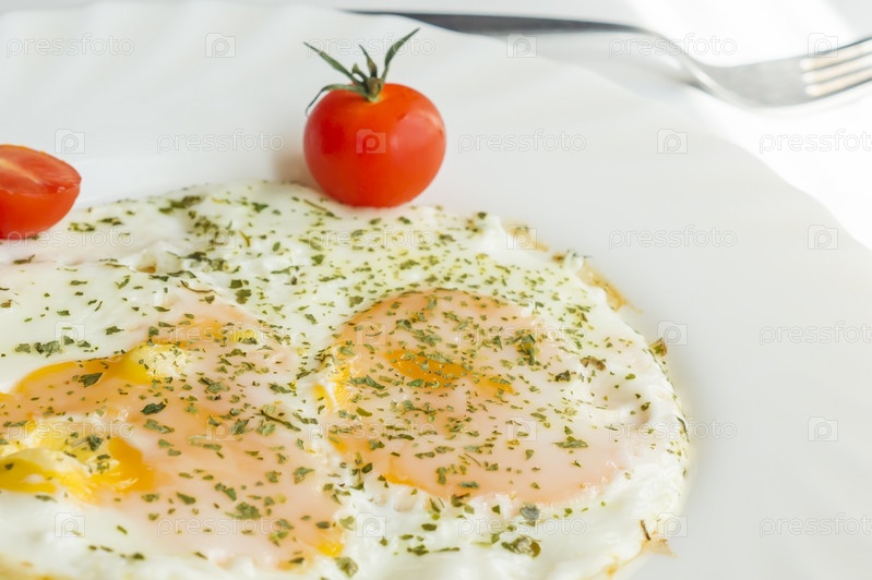 Яичница на тарелке с помидорами и рубленой петрушкой