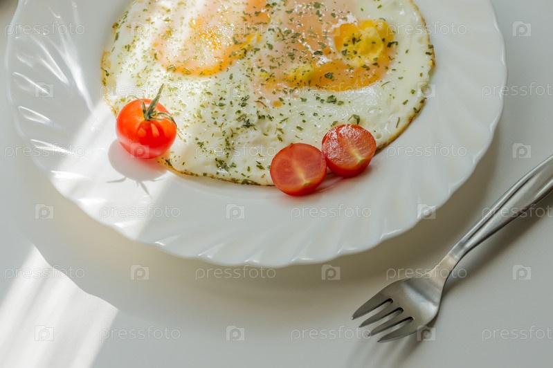 Яичница на тарелке с помидорами и рубленой петрушкой