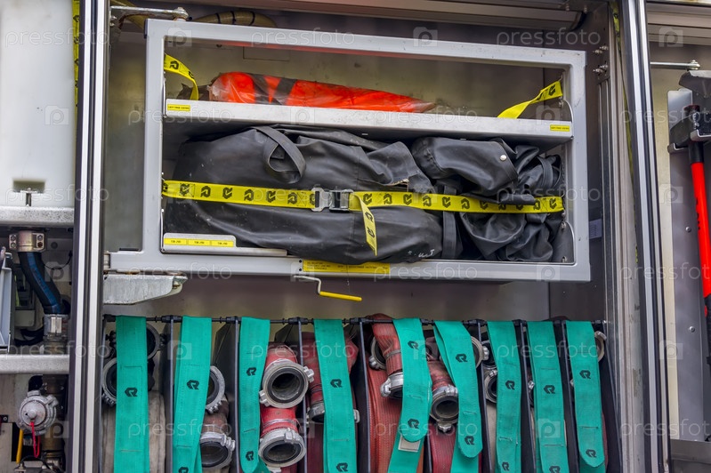 Москва. Россия. Май 2017 года. Пожарная часть. Подробная информация о спасательно-пожарном оборудовании