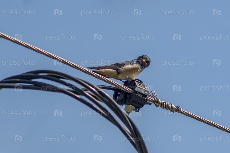 Проглотить в проводе на фоне голубого неба