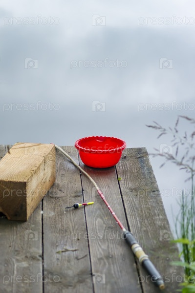 Снаряжение рыбака на деревянном мосту на фоне реки. Удочка на пирсе
