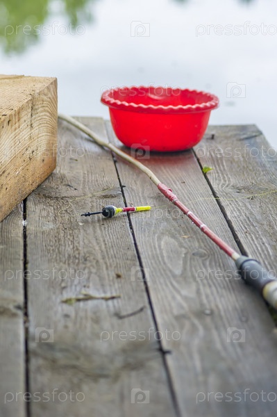Снаряжение рыбака на деревянном мосту на фоне реки. Удочка на пирсе