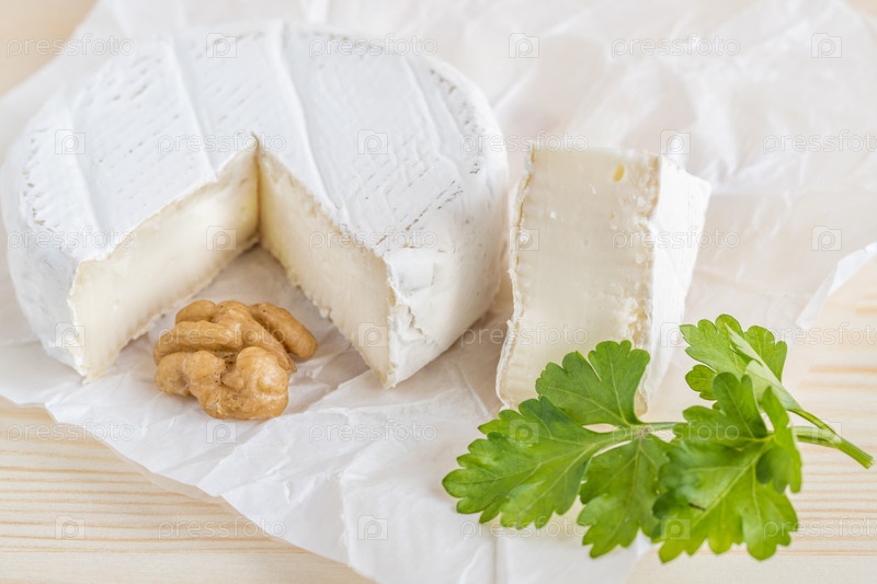 Камамбер, петрушка и грецкий орех на белой бумаге