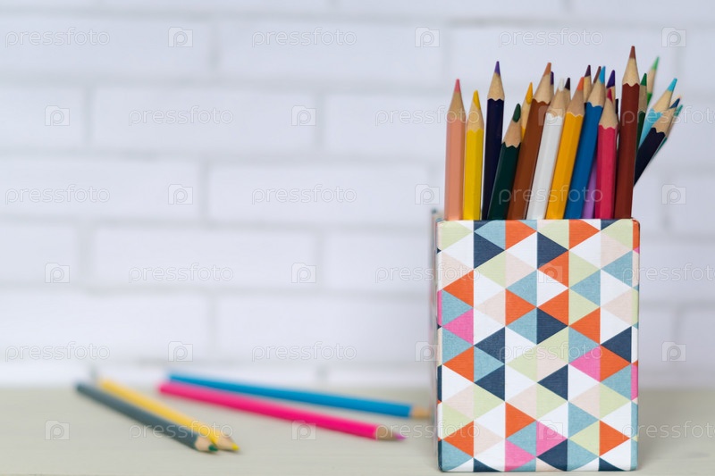Канистра с цветными карандашами на столе