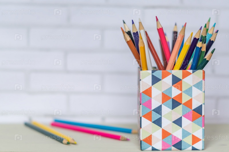 Канистра с цветными карандашами на столе