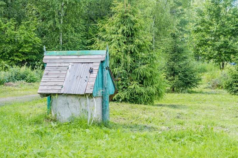 Закрытый деревенский деревянный колодец на фоне леса