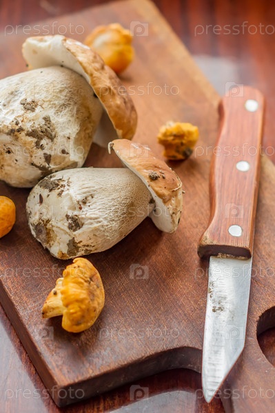 Лисички и белые грибы на деревянном столе