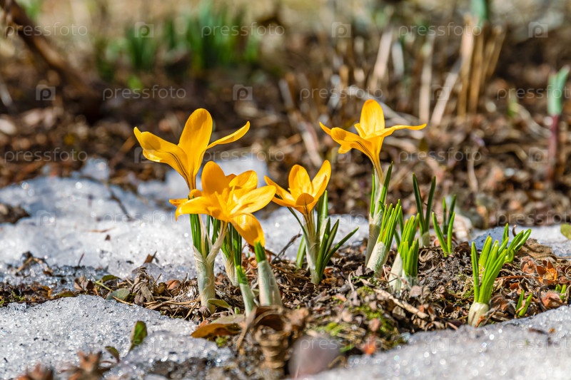 Крокусы анкарские желтые — многолетнее клубнелуковичное травянистое растение, вид рода Шафран семейства Ирисовые, или Касатиковые. весенний пейзаж