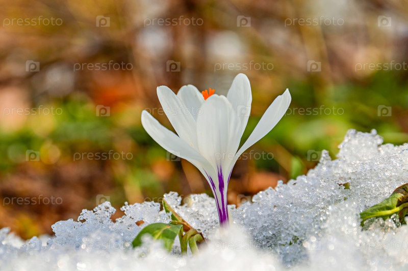 Красивый цветущий белый цветок крокуса весной. Весенние цветы