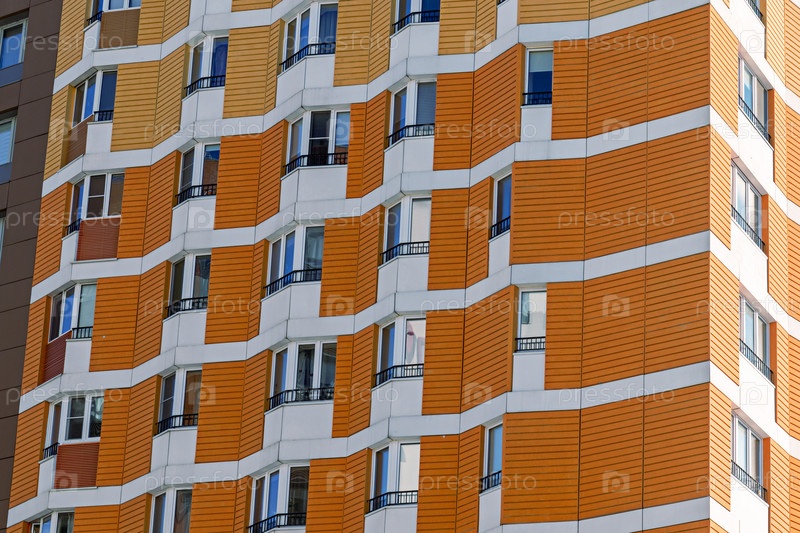 Многоквартирный дом с красочными фасадами. Современная минималистичная архитектура с множеством квадратных стеклянных окон и цветов на здании. Москва, Россия