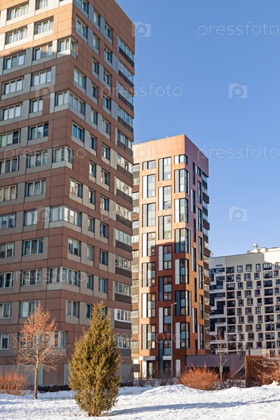 Многоквартирный дом с красочными фасадами. Современная минималистичная архитектура с множеством квадратных стеклянных окон и цветов на здании. Москва, Россия