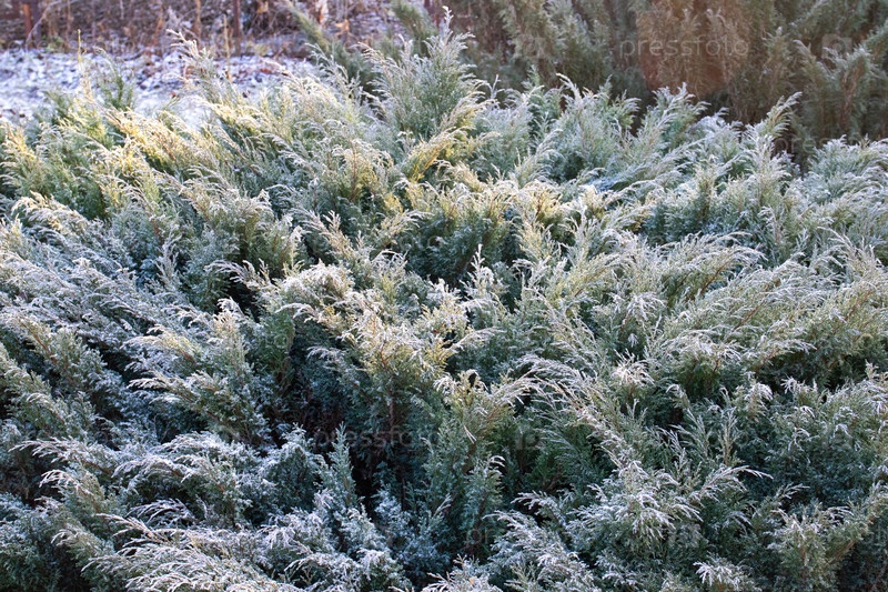 Зеленые ветви мохвельника Virginia Hetz покрыты иньей после первых осенних заморозков
