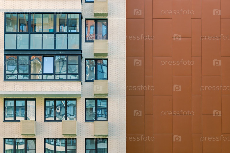 Многоквартирный дом с красочными фасадами. Современная минималистичная архитектура с множеством квадратных стеклянных окон и цветов на здании. Москва, Россия