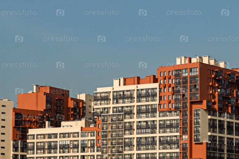 Многоквартирный дом с красочными фасадами. Современная минималистичная архитектура с множеством квадратных стеклянных окон и цветов на здании. Москва, Россия