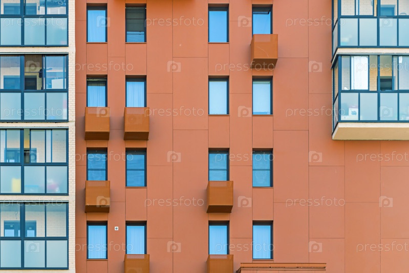 Многоквартирный дом с красочными фасадами. Современная минималистичная архитектура с множеством квадратных стеклянных окон и цветов на здании. Москва, Россия