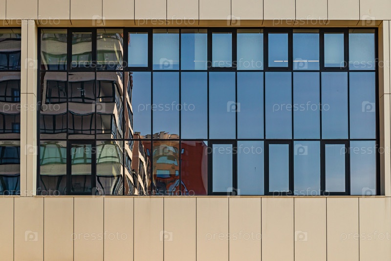 Многоквартирный дом с красочными фасадами. Современная минималистичная архитектура с множеством квадратных стеклянных окон и цветов на здании. Москва, Россия