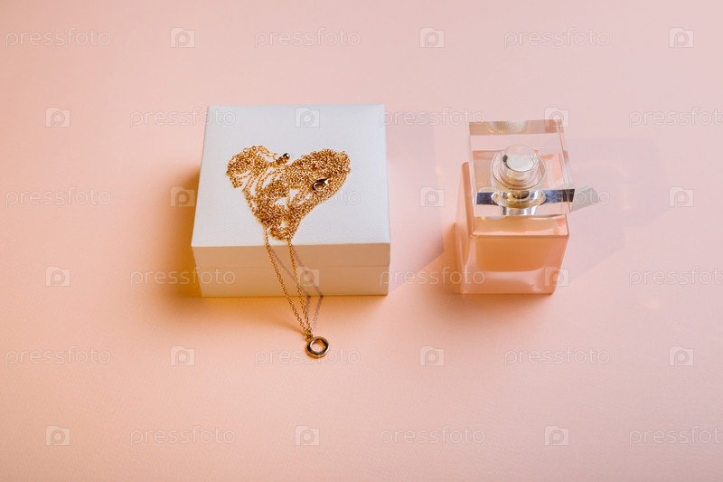 День Святого Валентина. Духи и коробка с цепочкой на розовом фоне