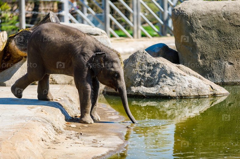Слоненок в зоопарке пьет воду из пруда