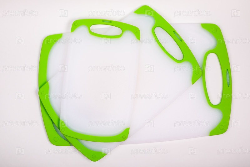 Набор белых кухонных разделочных досок с зелеными ручками для приготовления пищи