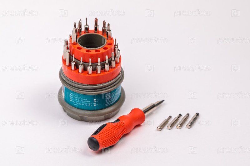 Набор рабочих инструментов с отверткой и битами для ремонта, в открытой пластиковой коробке с железными битами