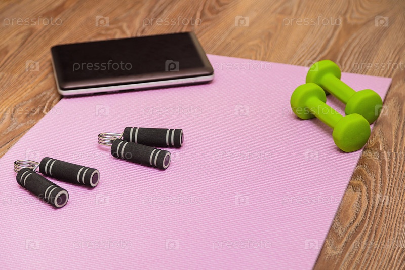 Коврик для фитнеса, гантели, эспандер и ноутбук для онлайн-тренировок дома