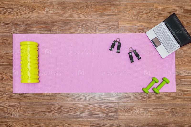 Коврик для фитнеса, гантели, эспандер и ноутбук для онлайн-тренировок дома