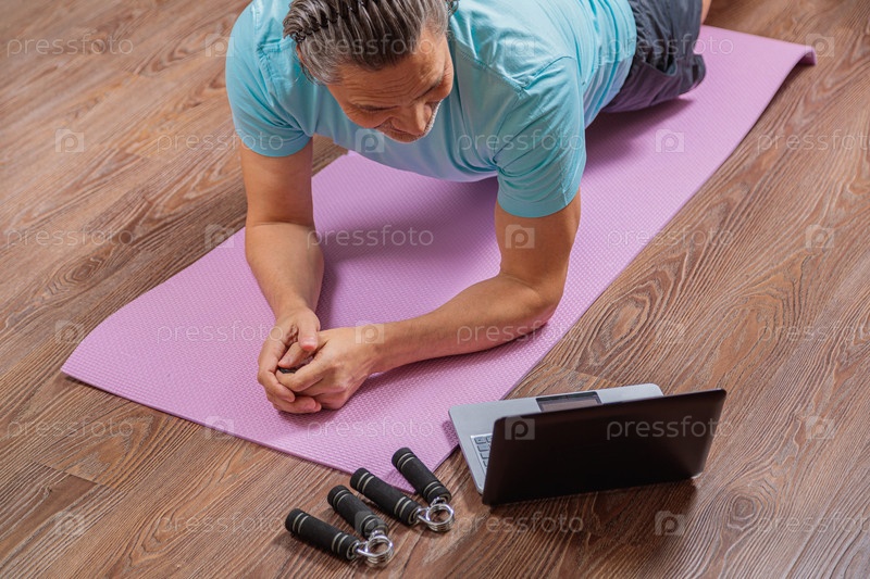 50-летний мужчина выполняет упражнения, лежа дома на коврике, глядя на компьютер