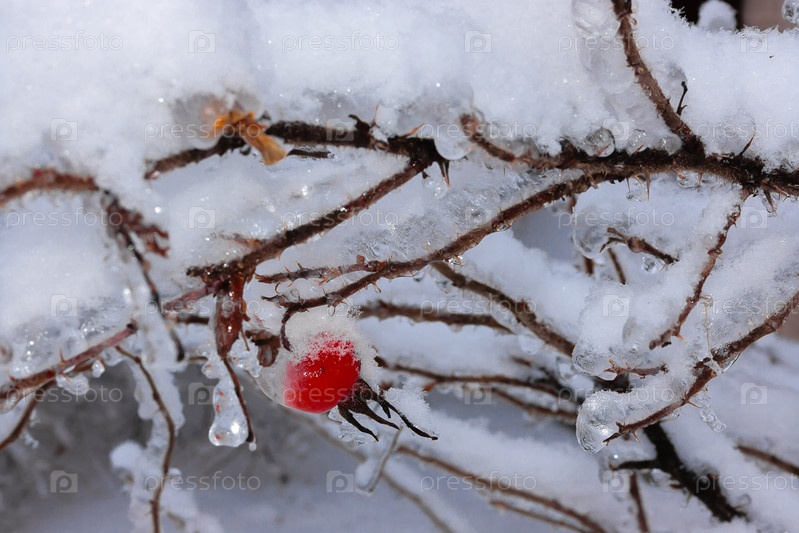 Тяжелые, ледяные ветви деревьев зимой с красным яблоком