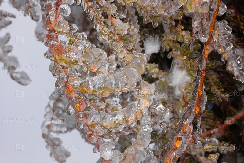 Зеленые еловые ветки в зимний день, покрытые льдом и снегом