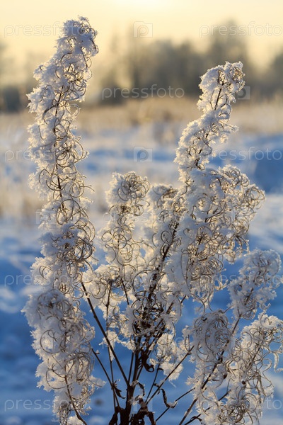 Колоски и ветки, покрытые инеем и снежинками в лесу, в солнечный день