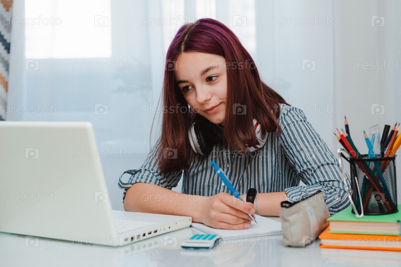 Девушка студент учится дома работает с ноутбуком делает домашнее задание слушает музыку лекция наушники дистанционное обучение общение