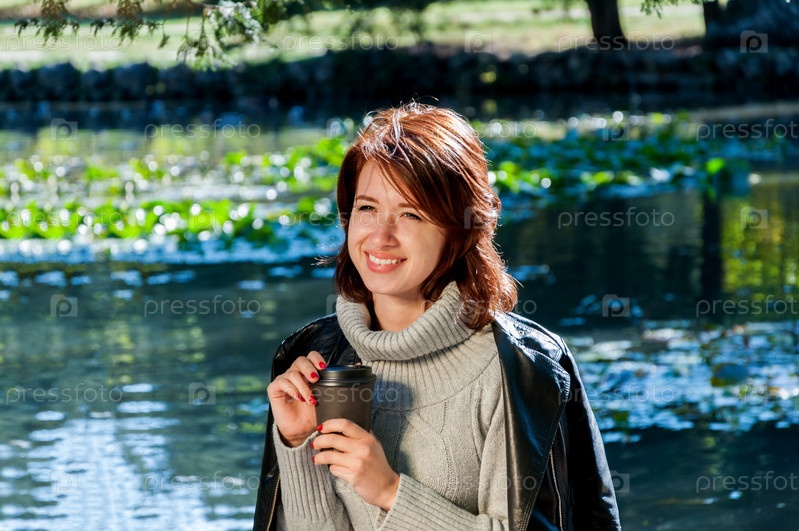 Милая девушка в свитере, джинсах и кожаной куртке с бумажным стаканчиком в руках на фоне озера