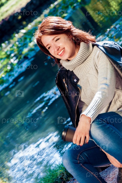 Милая девушка в свитере, джинсах и кожаной куртке с бумажным стаканчиком в руках на фоне озера