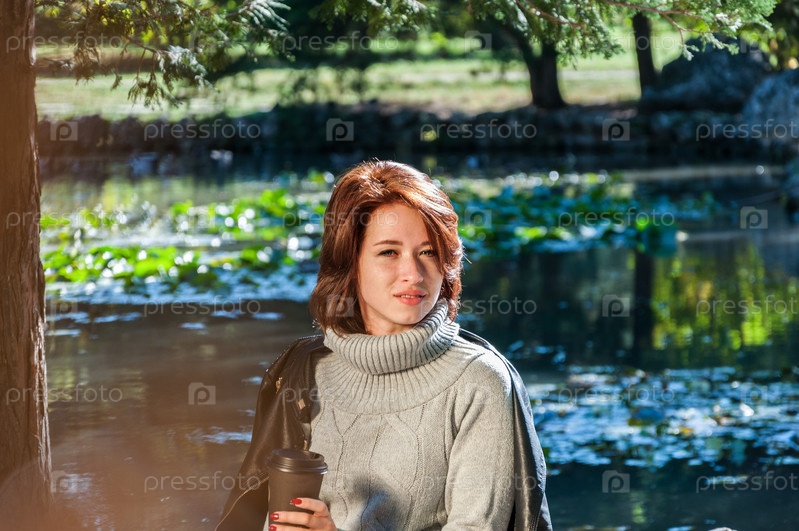 Милая девушка в свитере, джинсах и кожаной куртке с бумажным стаканчиком в руках на фоне озера
