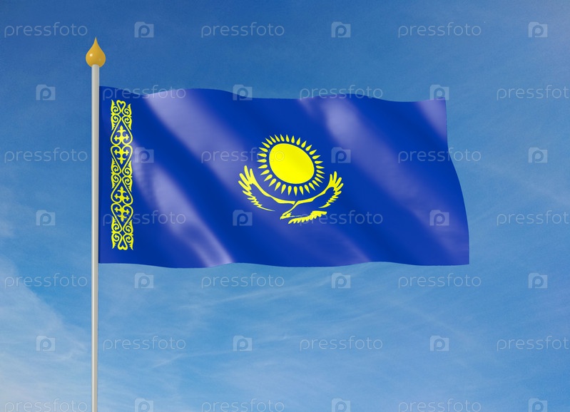 Развевающийся на ветру флаг Казахстана на фоне облаков