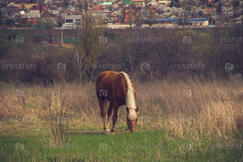 Коричневая лошадь со светлой гривой пасется на поводке в степи на фоне города