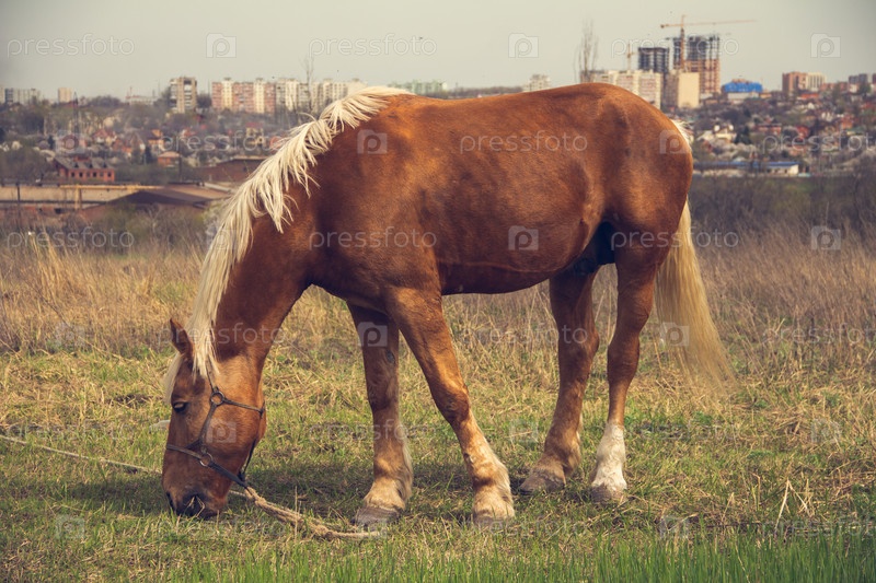 Коричневая лошадь со светлой гривой пасется на поводке в степи на фоне города