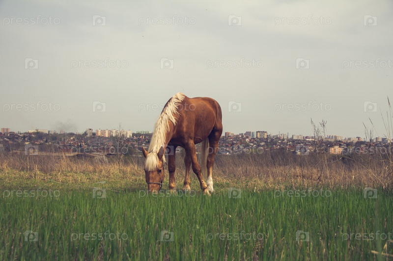 Коричневая лошадь со светлой гривой пасется на поводке в степи на фоне города