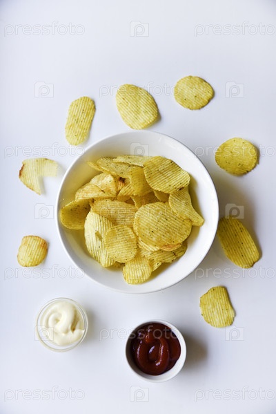 Рифленые картофельные чипсы с перцем на белом фоне. Вкусные чипсы быстрого приготовления. с соусом